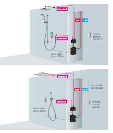 - Valve unit can be located up to 10 metres away from the showering area (data cable included).