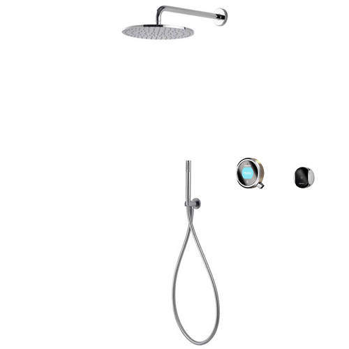 Aqualisa Q Edition digital smart shower pack 04N for gravity pumped systems (thermostatic). Complete kit with dual shower outlet mixer unit, controller, wireless remote control, slim handset, holder, wall outlet, round drencher shower head and metallic nickel accent pack.