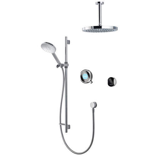 Aqualisa Q Edition digital smart shower pack 11GR for combination boilers and high pressure system (thermostatic). Complete kit with dual shower outlet mixer unit, controller, wireless remote control, shower handset, slide rail kit, wall outlet, round 300mm shower head, ceiling arm and shadow grey accent pack.