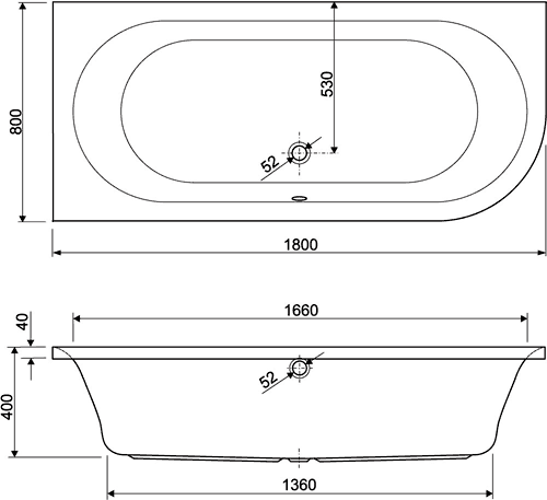 Corner, double ended bath with panel. Right handed. Size 1800 x 800mm.