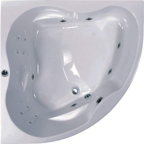 Large corner turbo whirlpool bath with 14 jets, legs, pre-fitted pump. Size 1500 x 1500mm.