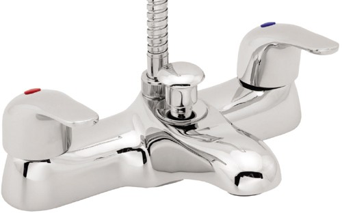 Bath shower mixer tap in chrome with shower kit. This product can be fitted with a Deva flow restrictor to reduce water wastage and protect the environment.