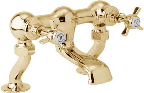 Bath filler tap in gold. Features adjustable pillars for easy installation.