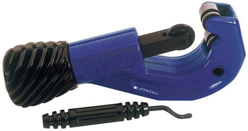 Tubing cutter with 6 to 38mm capacity. Expert quality adjustable tubing cutter with diecast body, hardened steel blade and two flare groove rollers. The body incorporates a retractable reamer with spare cutting wheel in adjusting knob.