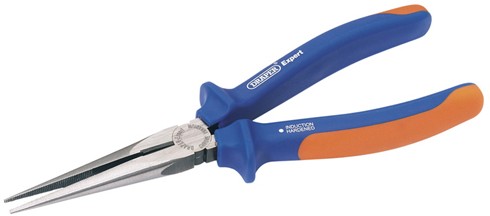 Long nose pliers. 200mm. Expert quality, drop forged from chrome vanadium steel, hardened and tempered with additionally induction hardened cutting edges. Has a lacquered finish for corrosion protection, with heavy duty soft grip handles with slip guards. Manufactured to DIN Standard.