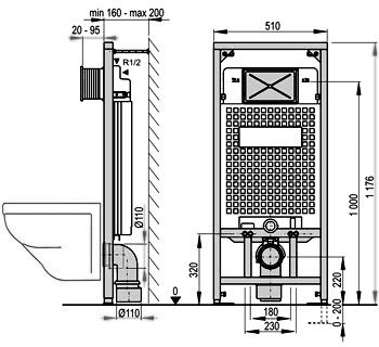Concealed frame for wall hung WC and dual flush cistern. Size 1176 x 510 mm. Francis Pegler flush plate required.