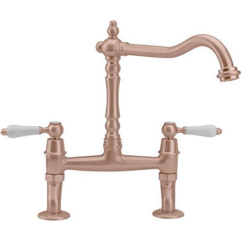 Hydra Bexley bridge kitchen tap in copper finish with swivel spout and lever controls.