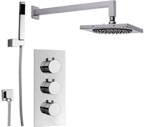 Twin thermostatic concealed shower valve with wall mounted arm, square shower head, shower handset and hose in chrome.