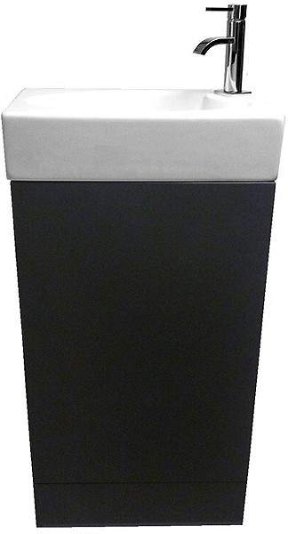 Cloakroom vanity unit in black with internal shelf and 1 tap hole ceramic basin. Size 450W x 860H mm.