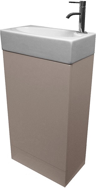 Cloakroom vanity unit in cappuccino with internal shelf and 1 tap hole ceramic basin. Size 450W x 860H mm.