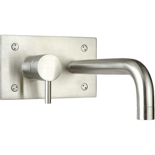 JTP Inox wall mounted basin mixer tap in stainless steel with rectangular backplate and 225mm spout.