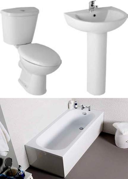 G4K complete bathroom suite with 1400x700mm single ended bath, toilet pan, soft close seat, cistern, basin and pedestal.