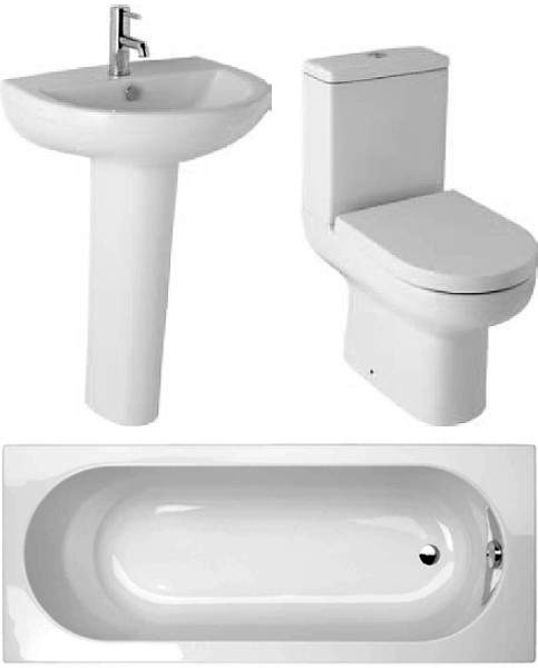 Revive bathroom suite with 1600x700mm single ended bath, toilet pan, soft close seat, cistern, basin and pedestal.