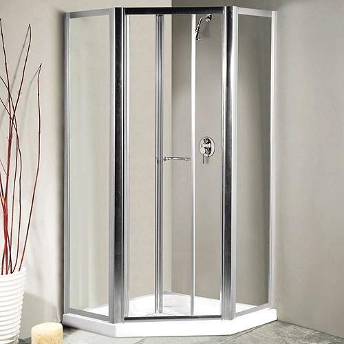 Pentagon semi-frameless shower enclosure in silver with bi-fold door and low profile shower tray.