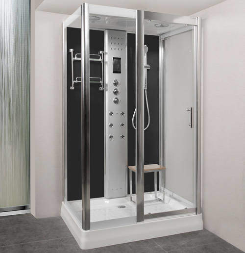 Rectangular steam shower enclosure / pod in chrome with black glass (1200x900mm).
