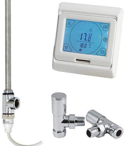 Digital touch screen thermostat with 300w radiator element and modern angled valves.
