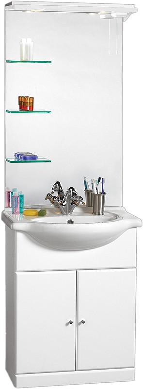 650mm Contour Vanity Unit with one piece ceramic basin, mirror, lights, shaver socket and shelves.