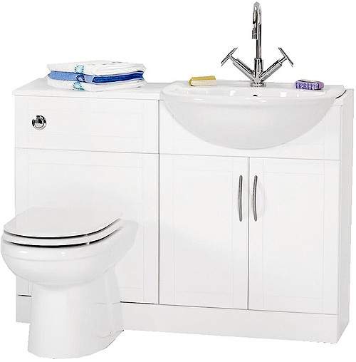 White bathroom furniture suite with basin on right hand side.