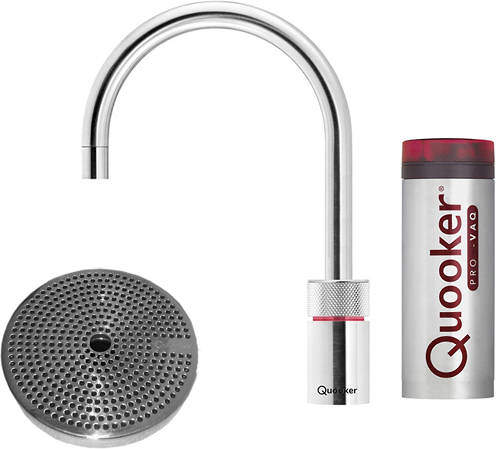 Quooker Nordic Round instant filtered boiling hot water kitchen tap with drip tray (font waste). Brushed chrome finish. (PRO7-VAQ).