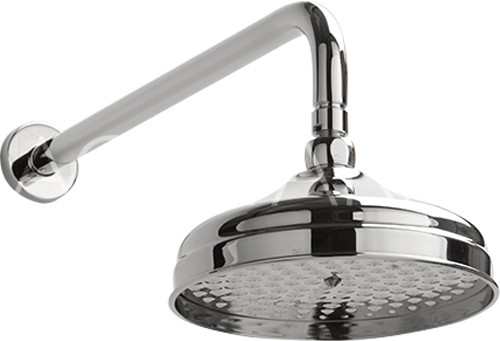 York traditional 200mm shower head in chrome with wall mounting arm.