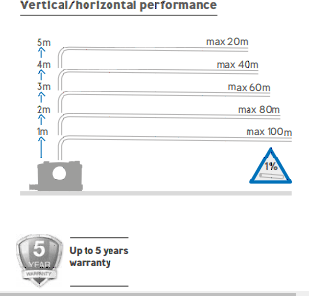 - Pumps up to a maximum height of 5 meters or a maximum horizontal distance of 100 meters.