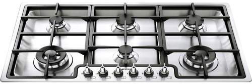 Classic ultra low profile 6 burner gas hob in stainless steel. Size 90cm.