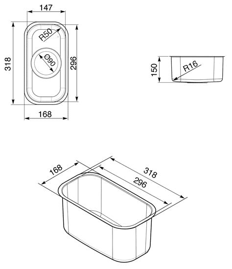 Larger image of Smeg Sinks Mira Undermount Kitchen Sink 150x320mm (S Steel).Technical image of Smeg Sinks Mira Undermount Kitchen Sink 150x320mm (S Steel).