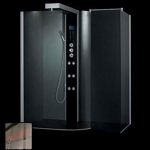 Walk in shower enclosure with shower valve, handset, rain shower and body jets Size 1500x900mm. Suitable for wetrooms. Right handed.