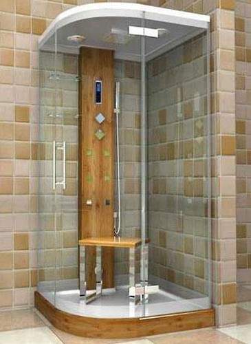 Quadrant steam shower cubicle in bamboo finish, 8mm safety glass. steam generator, chromatherapy lighting, seat, body jets and shower tray. Size 1000x1000mm.