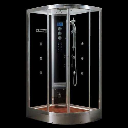 Offset quadrant, steam shower enclosure in aluminium with 8mm thick glass, black glass back panel, shower tray, waterproof oak floor and folding seat. Left handed. Size 1200x900mm.