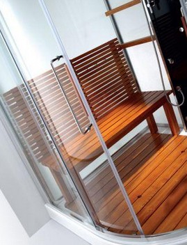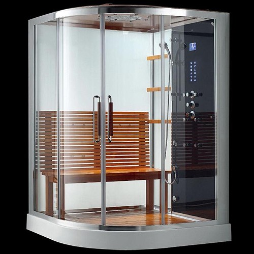 Corner steam shower enclosure in aluminium with 8mm thick glass, black and white glass back panel, waterproof oak floor, bench seat and shower tray. Size 1500x1500mm.