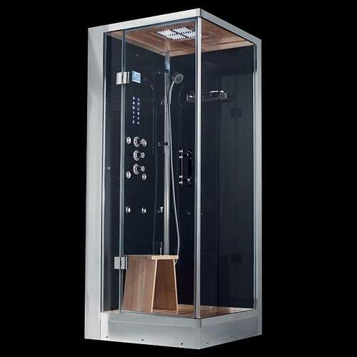 Square steam shower enclosure in aluminium with 8mm thick glass, black glass back panel, shower tray, waterproof teak floor, teak ceiling and removable teak seat. Left handed. Size 900x900mm.
