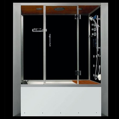 Inset steam shower bath with enclosure, 8mm thick safety glass, body jets, chromatherapy lighting, hinged door, black glass back panel, wooden ceiling and removable seat. Size 1750x850mm.