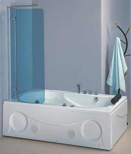 Left handed shower bath with 6 jet whirlpool system. Size 1800x980mm. Depth 560mm. Comes complete with curved glass shower screen. Also includes front and end bath panels.