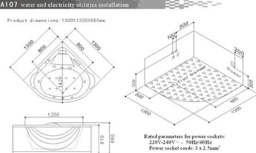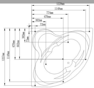 Corner whirlpool bath with panel. Size 1300x1300mm.