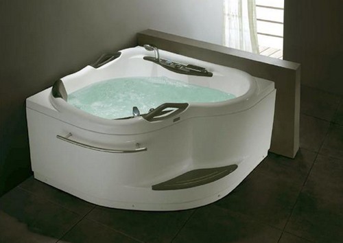 Corner whirlpool bath with bath panel and head rest. Size 1380x1380mm.