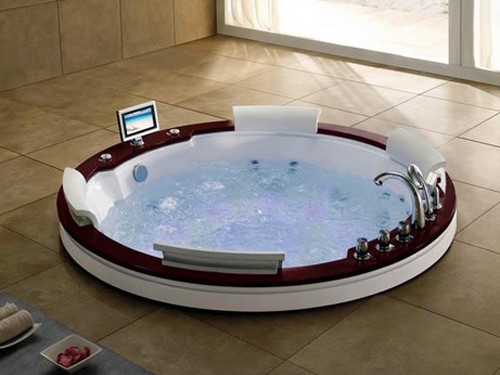 Round sunken whirlpool bath with TV and oak surround. Size 1900x1900mm.