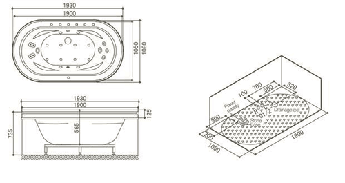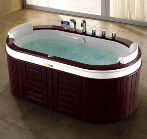 Freestanding whirlpool bath with oak surround. Size 1930x1080mm.