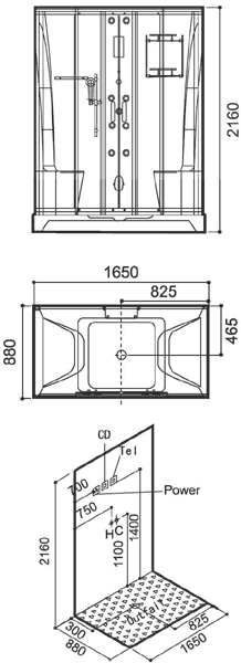 - Shower tray: Height adjustable nylon feet, built in waste and trap. Constructed from strong 12mm resin gel coated fibreglass with stainless steel subframe.