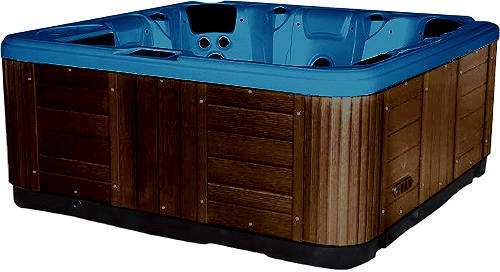 Hydra 6 person Hot Tub in cloud blue with chocolate cabinet and grey cover. Size: 2000x2000x850mm.