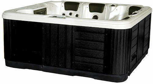 Ocean 5 person Hot Tub in white pearlescent with black cabinet and brown cover. Size: 2000x2000x850mm.