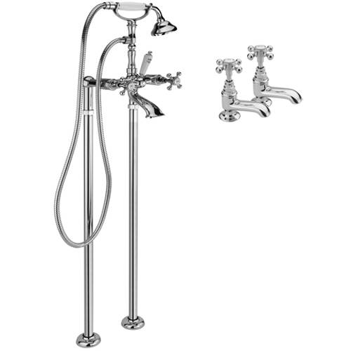 Tre Mercati Allora basin taps and floor standing bath shower mixer tap pack in chrome finish with shower kit.