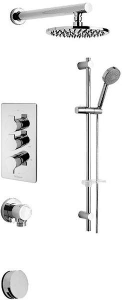 Thermostatic 3 way concealed shower valve in chrome with slide rail kit, wall outlet, round head, arm and auto bath filler waste.
