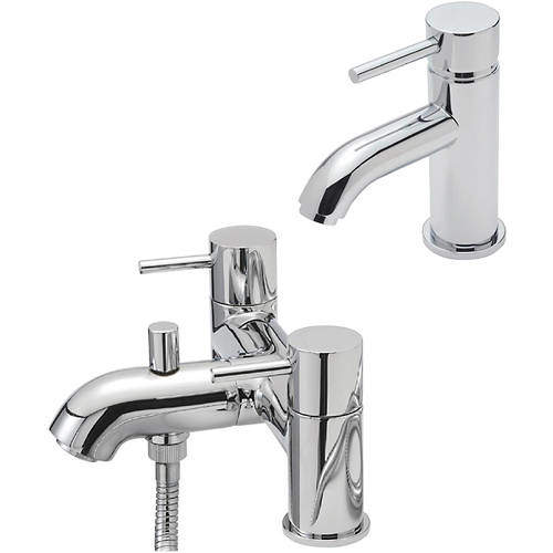 Tre Mercati Milan mono basin and pillar bath shower mixer tap pack in chrome finish with shower kit.