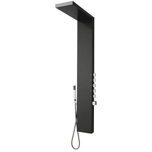 Dusk thermostatic shower panel in gun metal finish with rain shower head, waterfall option and body jets.