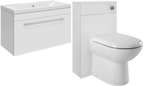 Design wall mounted vanity unit in white with ceramic basin (option 2), back to wall unit, pan, cistern and soft close seat.