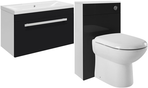 Design wall mounted vanity unit in black with ceramic basin (option 2), back to wall unit, pan, cistern and soft close seat.