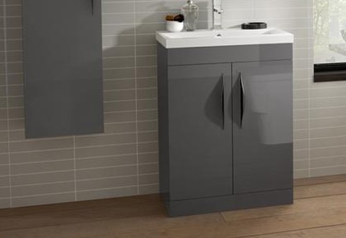 600mm Vanity unit in gloss grey with doors, chrome handle and 122 mid-edged basin.