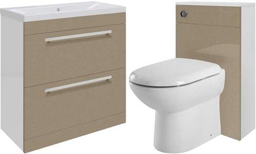 Design vanity unit in caramel with ceramic basin (option 2), back to wall unit, pan, cistern and soft closing seat.