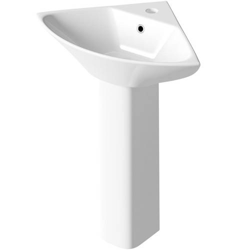 Carmela four piece bathroom suite with semi flush to wall toilet, cistern, seat, corner basin and pedestal.